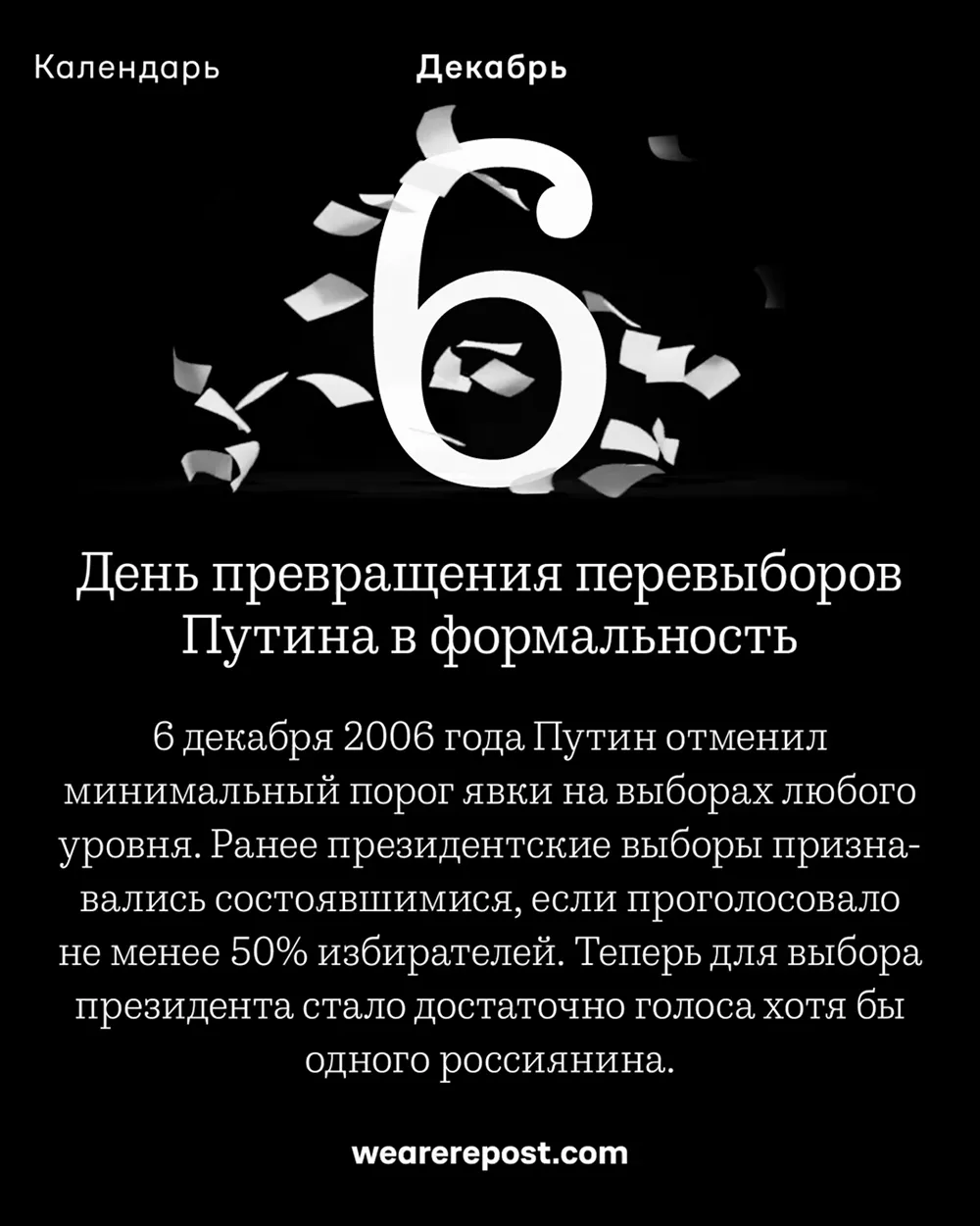 Минимальный порог явки позволял россиянам голосовать против формальных, неконкурентных выборов, просто оставаясь дома. А это заметно усложняло переизбрание Владимира Путина.